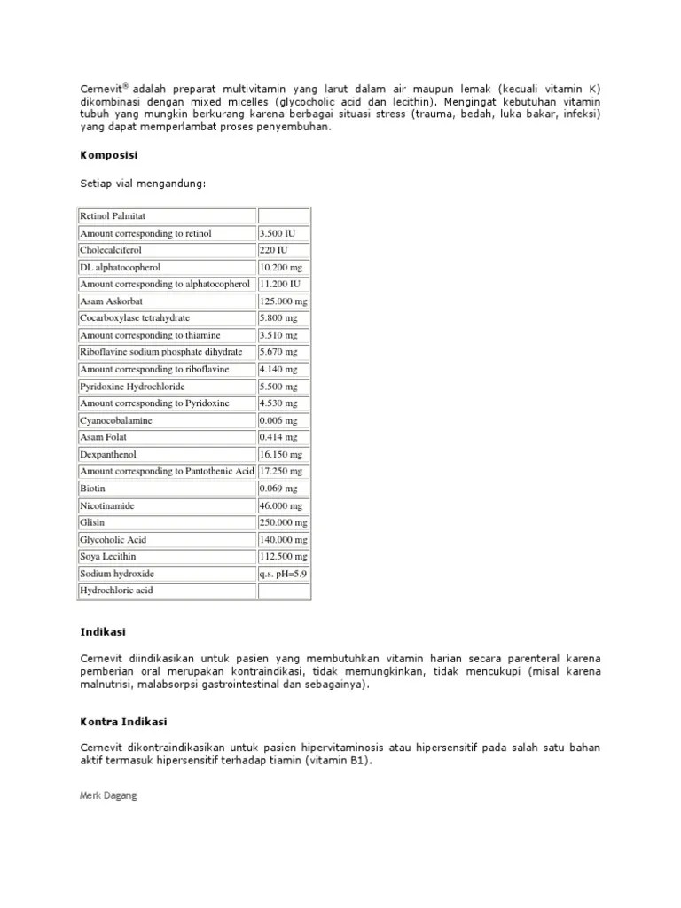 Obat ini diberikan sebagai multivitamin harian unruk pasien yang mendapat nutrisi lewat cern. Detail produk dari cernevit multivitamin injeksi · retinol :